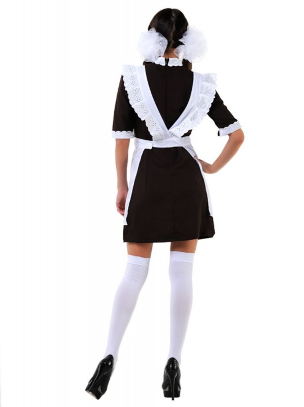 Комплект состоит из классического коричневого платья с белым воротничком и белоснежного фартука!